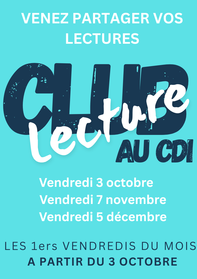 Vous aimez lire ? Vous avez envie de partager vos lectures ? Rejoignez-nous au club lecture, le vendredi 3 octobre, de 13 h à 14h au CDI.